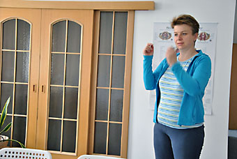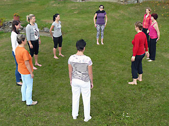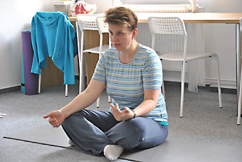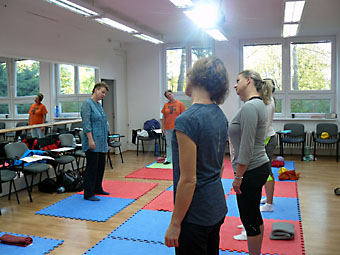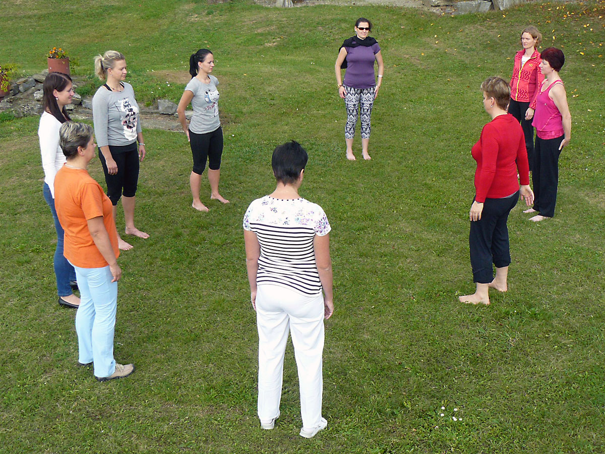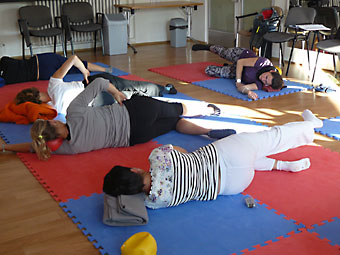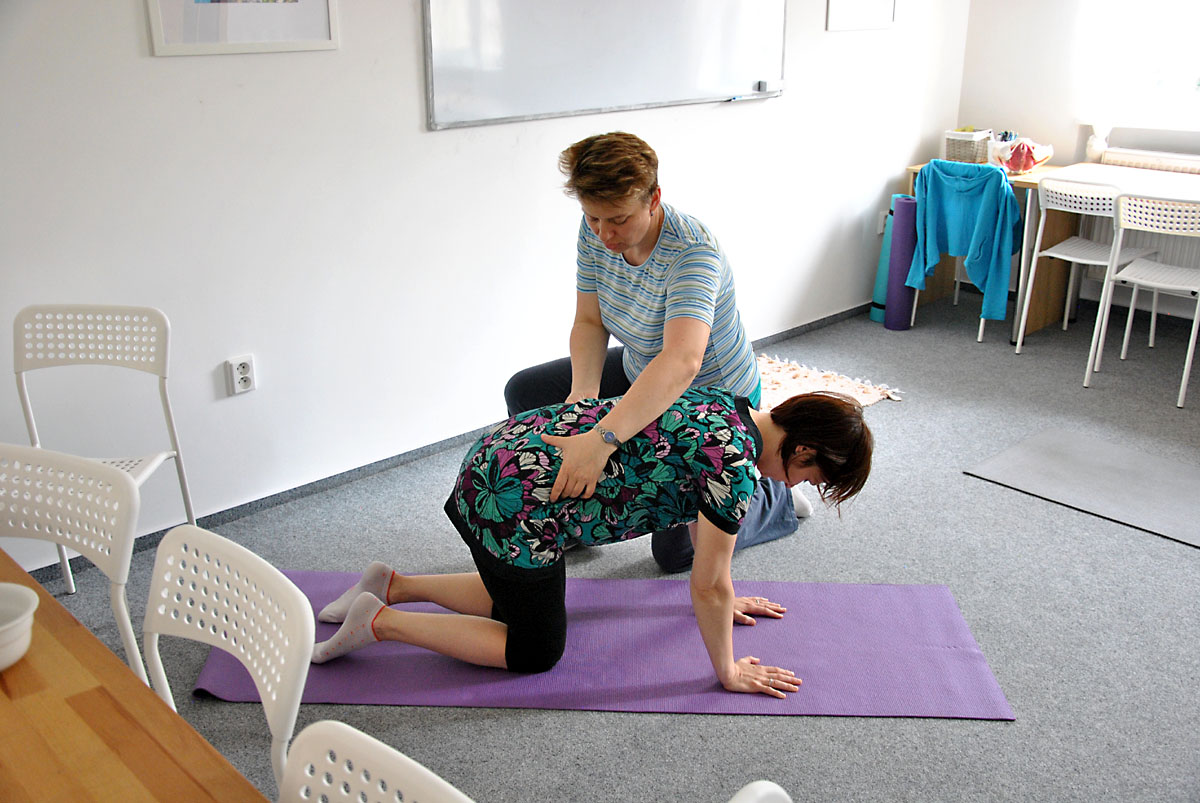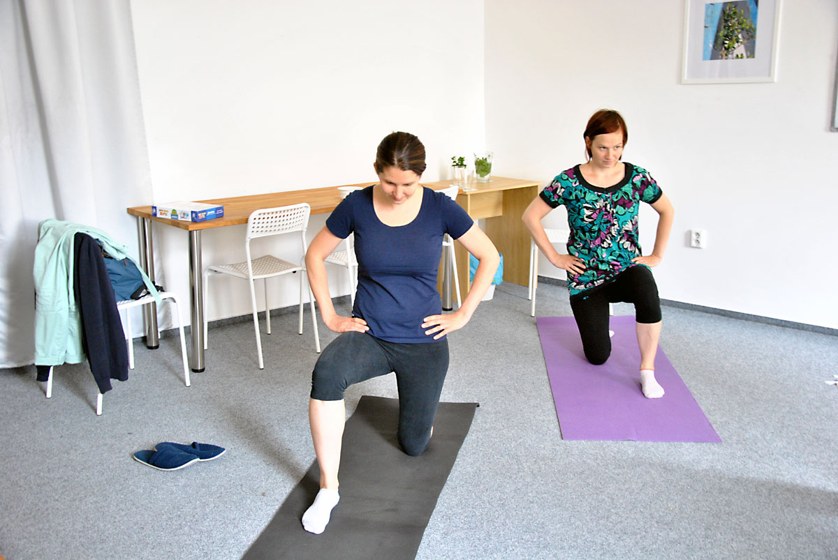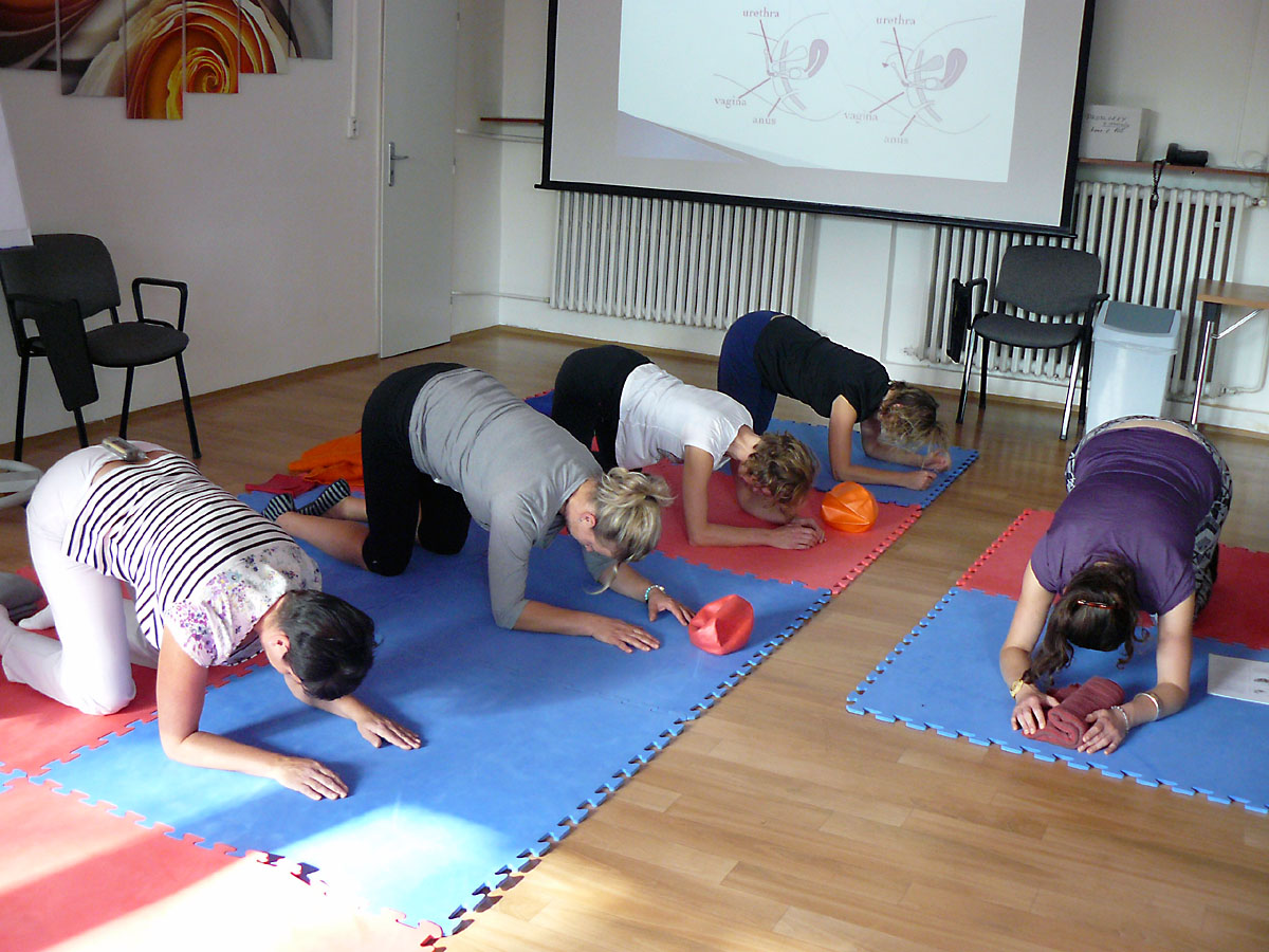 Po teoretické části s nezbytnou anatomickou průpravou o svalech a závěsném aparátu svalů pánevního dna jsme se pustili do praktického cvičení. V několika vstupech jsme zkoušeli na sobě aktivovat i relaxovat svaly pánevního dna v různých cvičebních pozicích.
